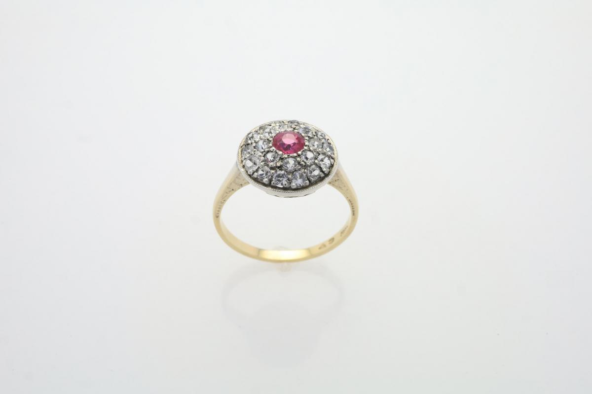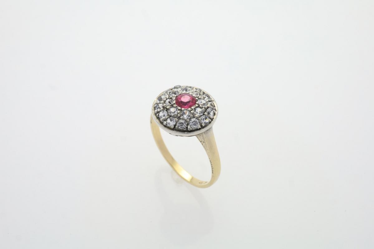 Zlatý starožitný prsten s leukosafíry a rubínem (1. Republika) 3,5 g 14kt